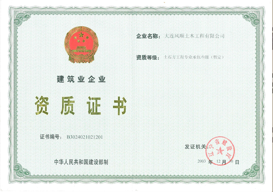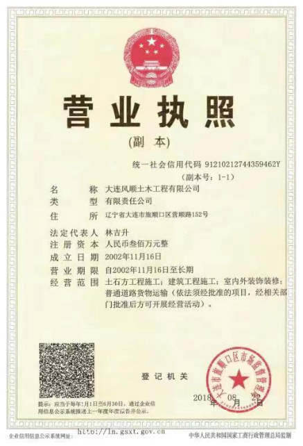 大連風(fēng)順土木工程有限公司成立于2002年10月是一家以專業(yè)經(jīng)營(yíng)大型土石方工程施工、建筑施工、室內(nèi)外裝飾裝修、拆遷施工、挖掘類工程及機(jī)械設(shè)備租賃的私營(yíng)公司,公司注冊(cè)資金300萬元,具有專業(yè)土石方工程施工資質(zhì)三級(jí),具有大型挖掘機(jī)、推土機(jī)、裝卸機(jī)、自卸翻斗車。